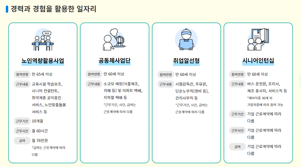 60세 이상 국민이면 누구나 지원할 수 있으며, 근무 시간과 활동비는 사업에 따라 다르지만 대체로 월 60시간 근무에 76만 1,000원을 지급합니다.